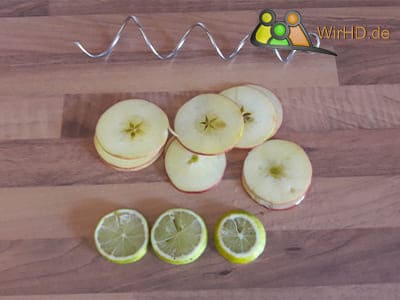 Auch musst du durch ein langsames herantesten herausfinden, wie dick oder dünn die Scheiben oder Stücke für dich optimal sind. Denn wenn du kein Bio-Obst benutzt, musst du bei den meisten Früchten leider die für Stabilität sorgende Schale abschneiden.