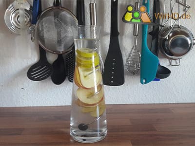 Was du auch nicht außer Acht lassen solltest. Je mehr Obst du in die Karaffe gibst, umso mehr hebt sich deshalb auch der Wasserspiegel an. Damit verändert sich das Fassungsvermögen unter Umständen doch sehr.